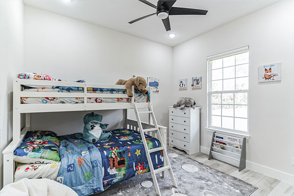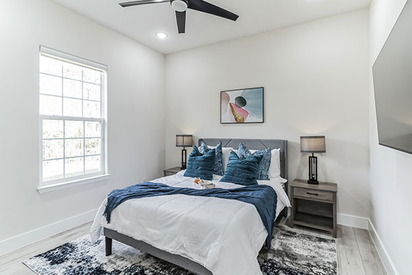 The spacious master bedroom suite features a tray ceiling with recessed lights, remote controlled fan with lights, huge walk-in closet, exterior door access to patio, luxurious tub with separate shower stall in master bath, dual sinks in vanity with granite countertops and floor tiles. This model has plenty of storage space and includes a 3 car garage.